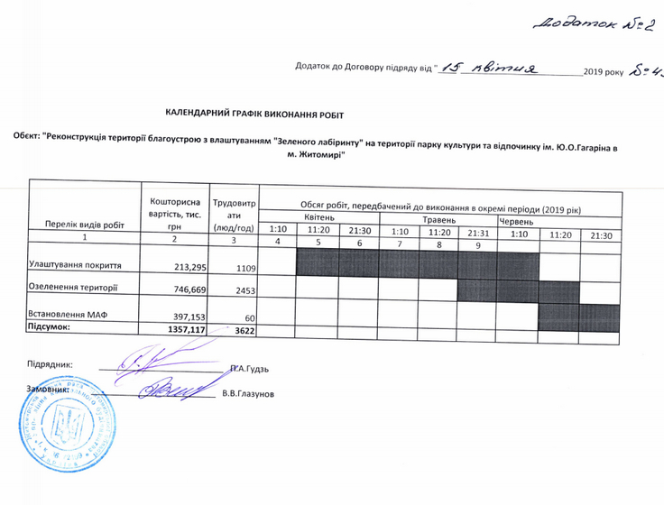 За цим договором, підприємець має провести реконструкцію території благоустрою з влаштуванням «Зеленого лабіринту» у парку культури та відпочинку ім. Гагаріна в місті Житомир. Ціна договору є твердою і становить 1 млн 357,1 тис. грн, без ПДВ.
