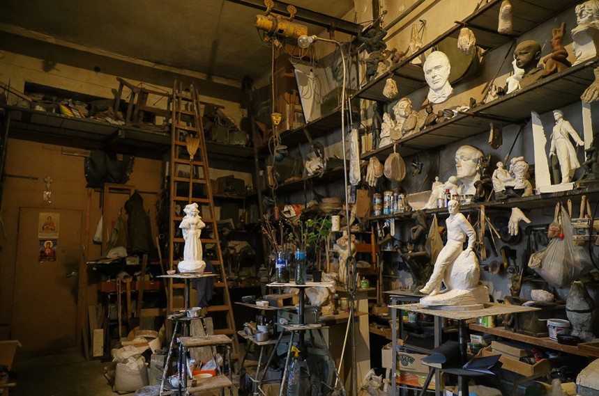 Безліч речей, які пересічні люди сприймуть за мотлох. Серед них, як квіти на смітнику, скульптури з різних матеріалів та розмірів. Величезна шафа книжок. Фотографії, вирізки з газет та журналів на стінах. Автографи на дверях. Величезна піч з мармуровими плитами. Гіпс у мішках. Кран на стелі… Саме так виглядає майстерня Василя Фещенка. Ми щодня проходимо повз скульптури, меморіальні дошки, погруддя, проте ніколи не задумуємося, хто і де їх створює.