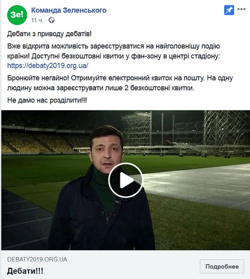 В ніч з 16 на 17 квітня на Facebook-сторінці «Команди Зеленського» з’явилося повідомлення про можливість «зареєструватися на найголовнішу подію країни» та забронювати безкоштовні квитки у фан-зону в центрі стадіону.