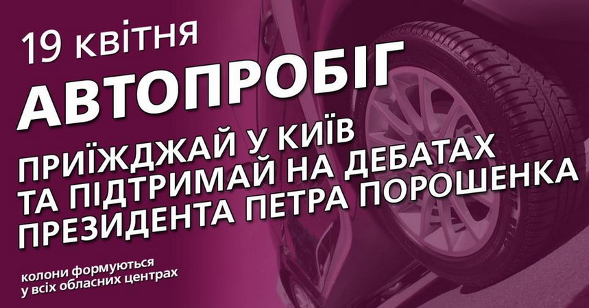 «Автопробіг на підтримку Президента України Петра Порошенка вирушає з кожного обласного центру до Києва. Приїжджай сам і привозь друзів на дебати, які відбудуться у НСК «Олімпійський». Давайте покажемо Україні, що нас багато. Давайте покажемо, що ми згуртовані та мобільні. Що нам небайдужа доля країни, і тому ми обираємо проукраїнського Президента», - пишуть організатори події.