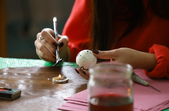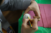 Студентка Євгенія демонструє свій виріб. Дівчина розповідає, що вже вдруге у своєму житті розмальовує писанку за такою технікою та ділиться, що такий народний живопис їй до вподоби.