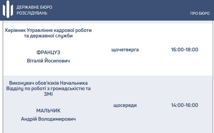 Скріншот графіку особистого прийому громадян з сайту ДБР