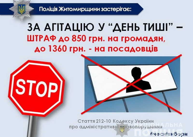 «Двох розповсюджувачів листівок поліцейські встановили. Відносно 27-річного бердичівлянина та 25-річного житомирянина складено матеріали за статтями 212-13 (Виготовлення або розповсюдження друкованих матеріалів передвиборної агітації, які не містять відомостей про установу, що здійснила друк, їх тираж, інформацію про осіб, відповідальних за випуск) та 212-14 (Порушення порядку розміщення агітаційних матеріалів чи політичної реклами або розміщення їх у заборонених законом місцях) Кодексу України про адміністративні правопорушення», – інформують у поліції.