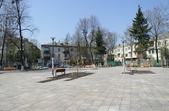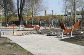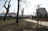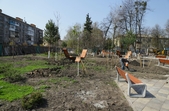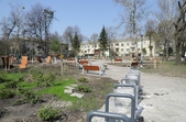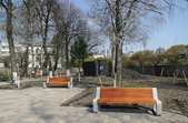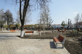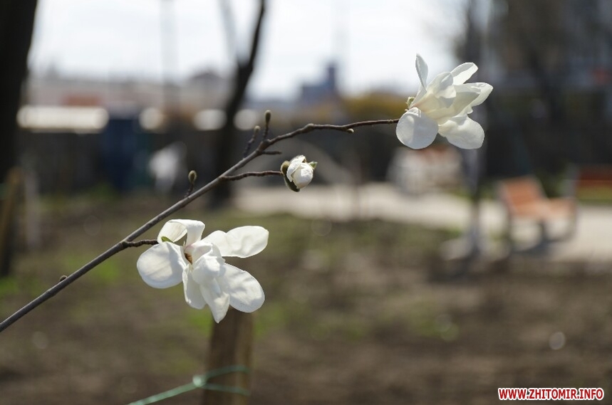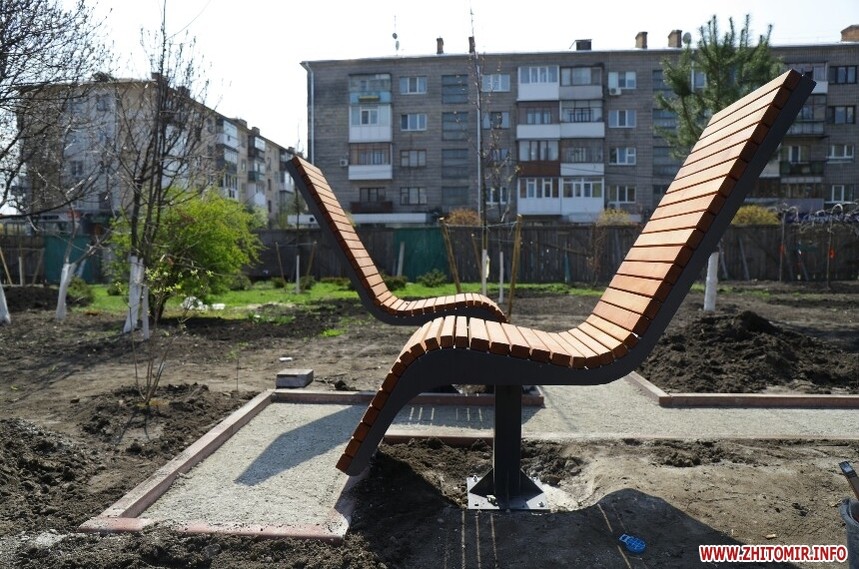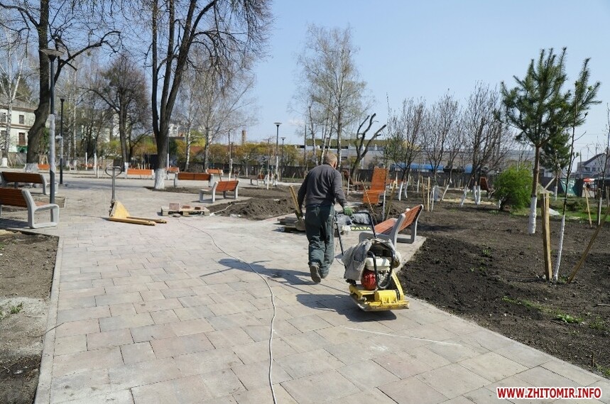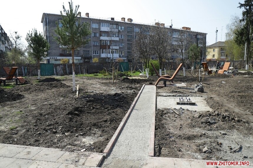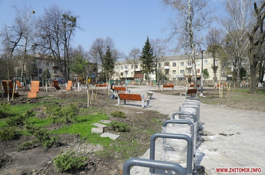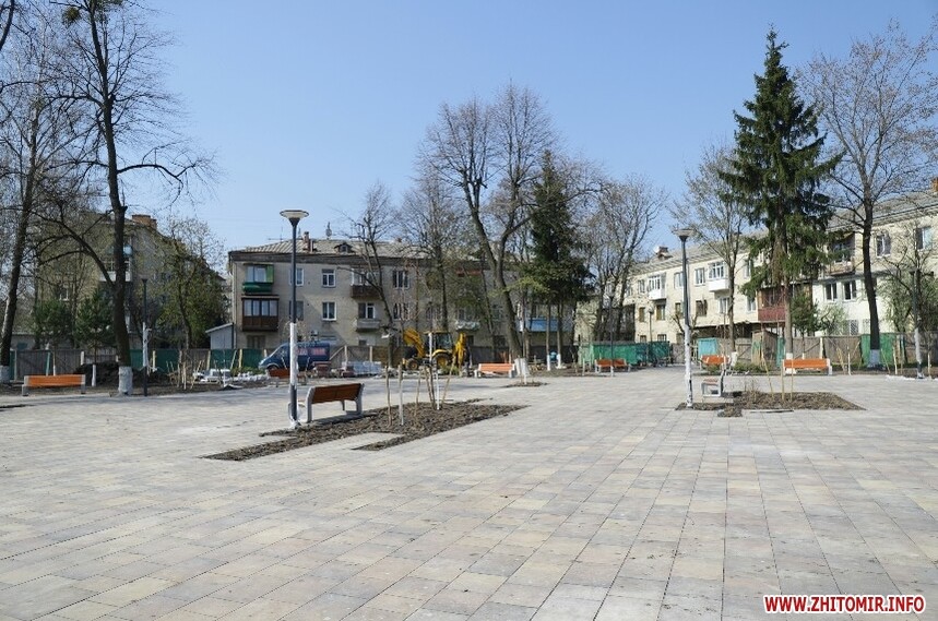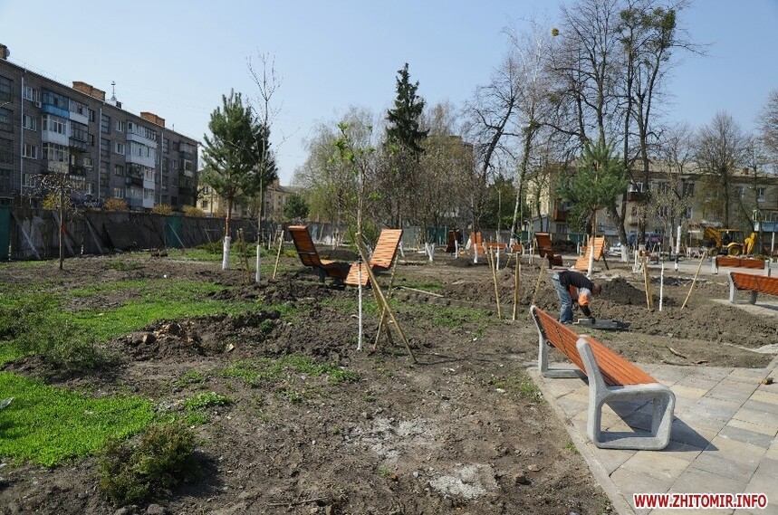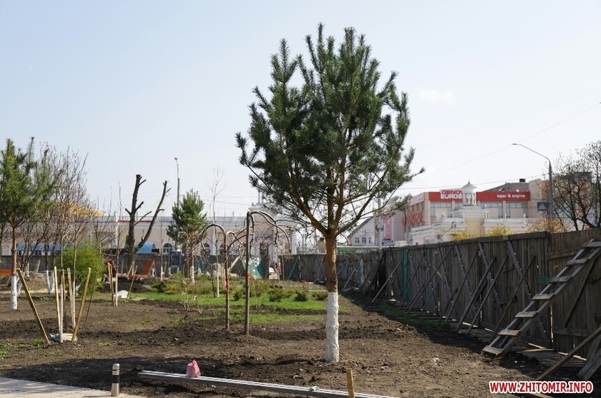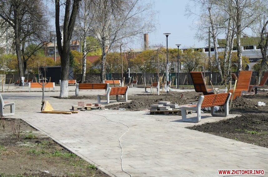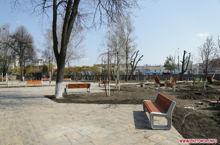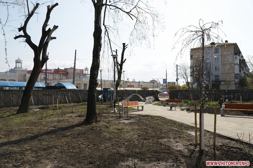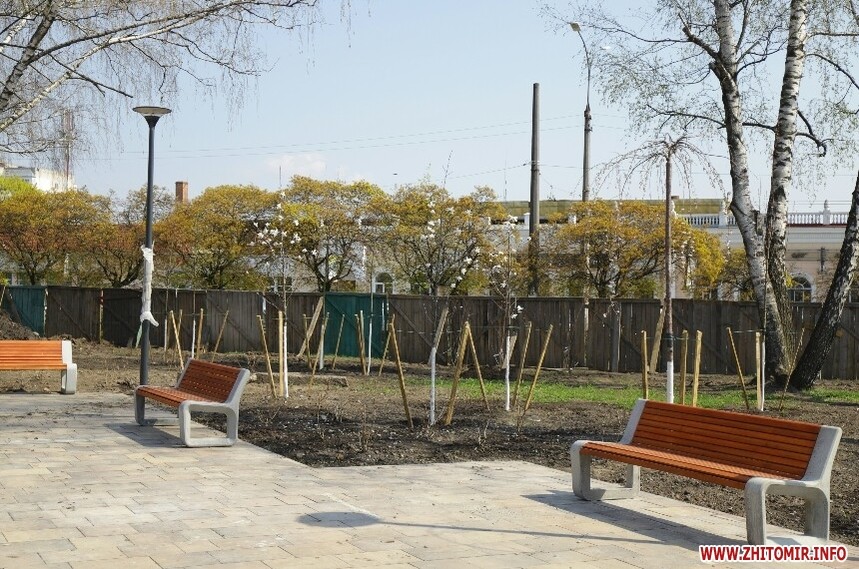 19 квітня фотокореспондент Житомир.info заглянула за паркан, яким огороджений сквер, й побачила побілені «старі» й нововисаджені дерева, а також встановлені одномісні лавки.