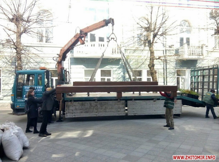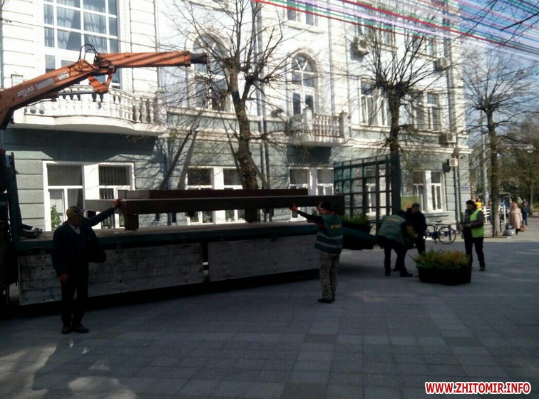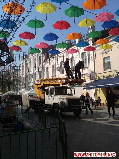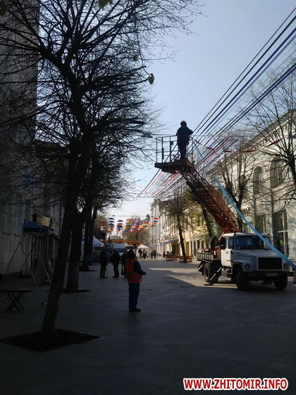 Нагадаємо, зранку 19 квітня на Михайлівській у Житомирі зняли «зимові» парасольки з ілюмінацією та почали декорувати пішохідну вулицю до Великодніх свят: розвішувати кольорові стрічки.