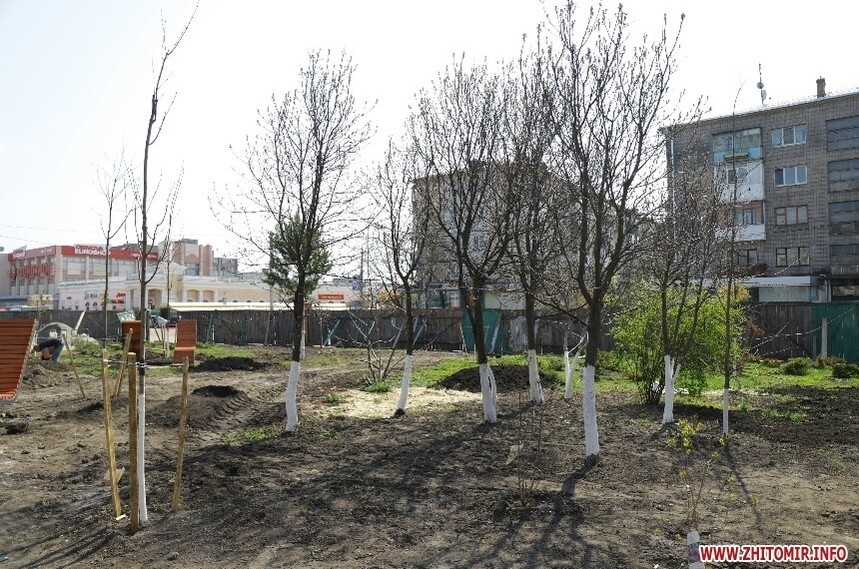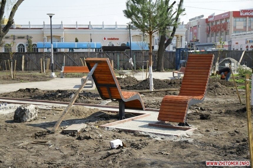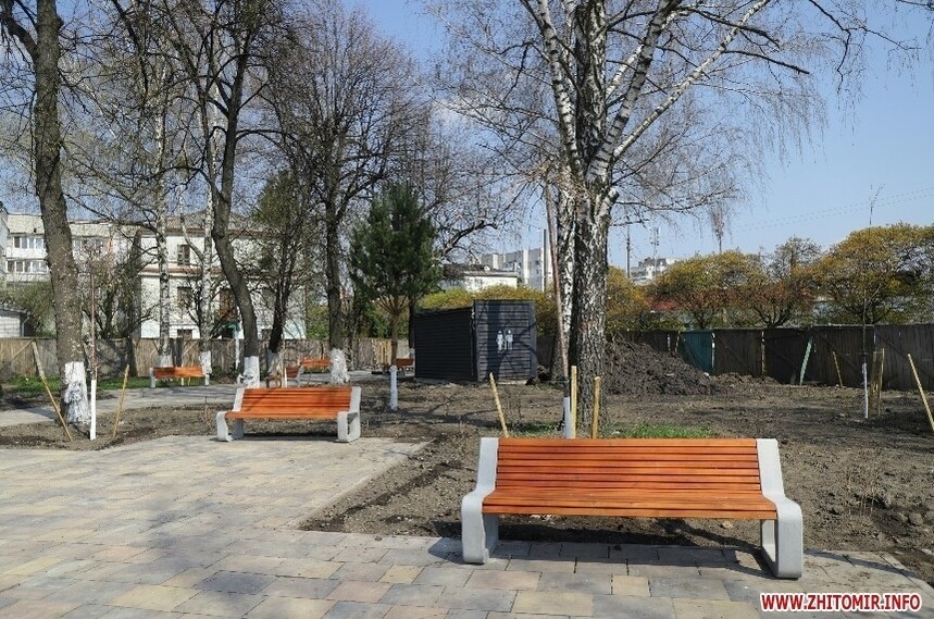 19 квітня фотограф Житомир.info прогулявся сквером на Лятошинського, де досі триває реконструкція, але вже встановили лавки та побілили дерева.