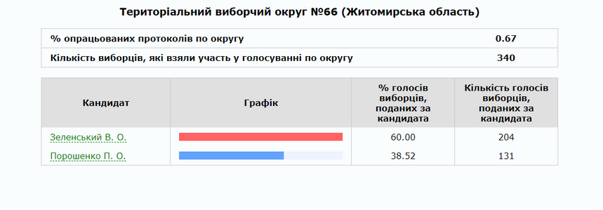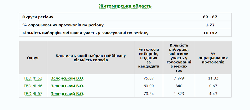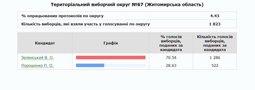 Крім того, станом на 23.00, ЦВК опрацювала 4,43% протоколів по округу №67 (м. Чуднів) та 0,67% протоколів по округу №66 (м. Малин). В усіх округах на даний момент перемагає Володимир Зеленський.