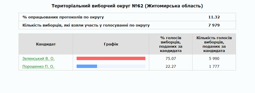Так, за даними ЦВК, вже опрацьовано 11,32% протоколів по виборчому округу №62 у Житомирі. Згідно цих опрацьованих протоколів, за Володимира Зеленського проголосувало 75% виборців, за Петра Порошенка – 22%.