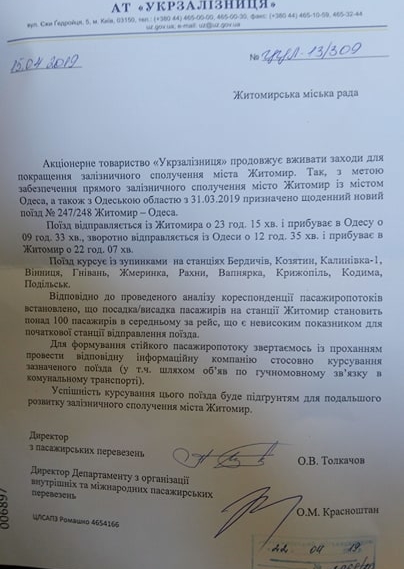 Акціонерне товариство «Укрзалізниця» звернулося до Житомирської міської ради з проханням провести у місті інформаційну кампанію стосовно курсування поїзда № 247/248 «Житомир – Одеса», який, запустили 31 березня 2019 року.