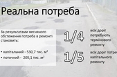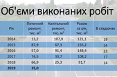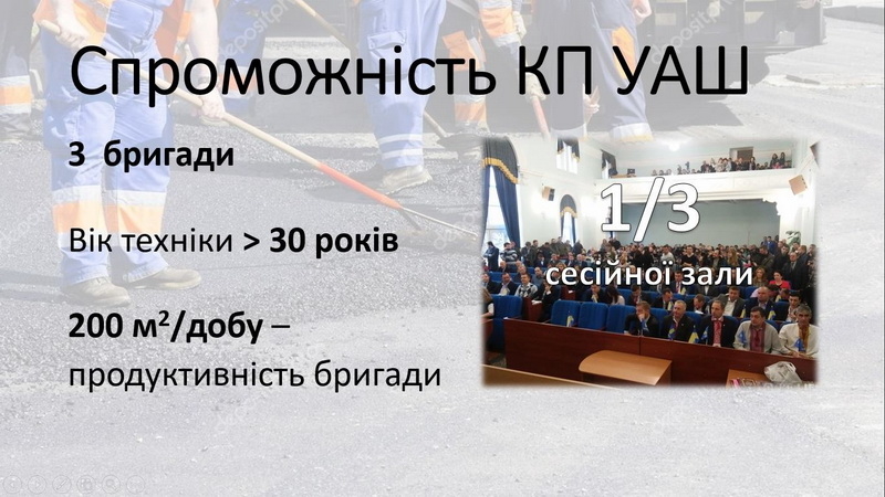 У слайдах до допису йдеться про недостатнє забезпечення КП «Управління автомобільних шляхів» людським і технічним ресурсом. Зазначено, що в КП працюють лише три бригади, вік техніки – близько 30 років, продуктивність однієї бригади – 200 кв. м. на добу.