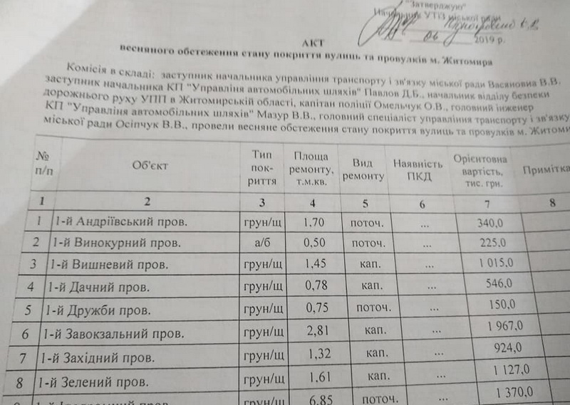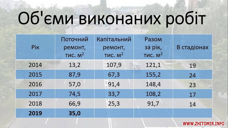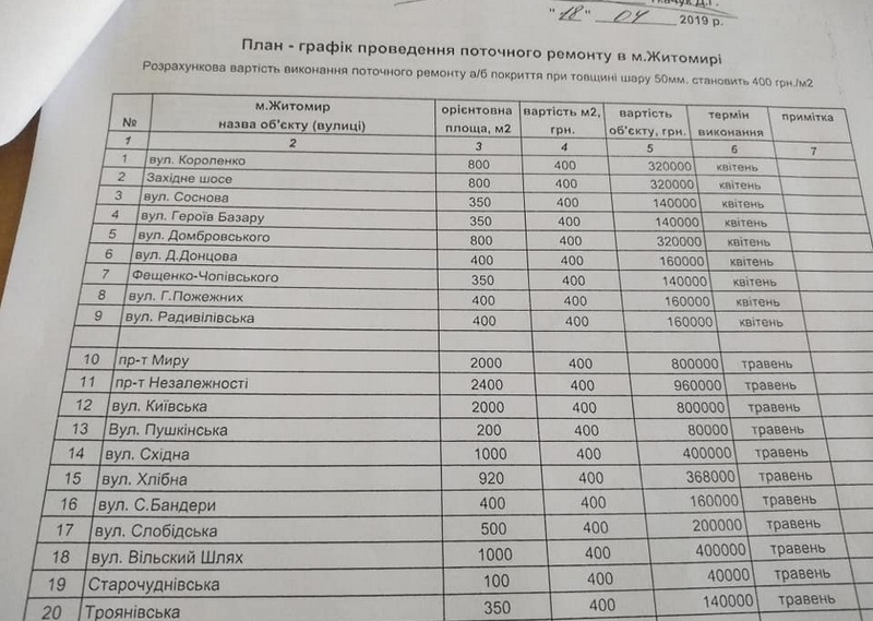 Як повідомляв Житомир.info, 22 лютого 2019 року виконком Житомирської міської ради на черговому засіданні затвердив перелік доріг, які капітально відремонтують цього року. У списку – 9 вулиць.
