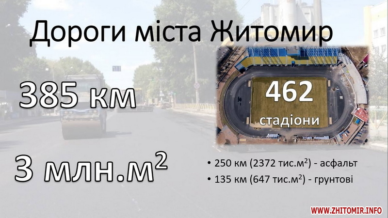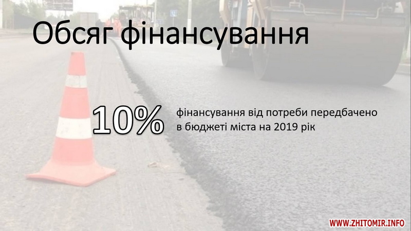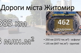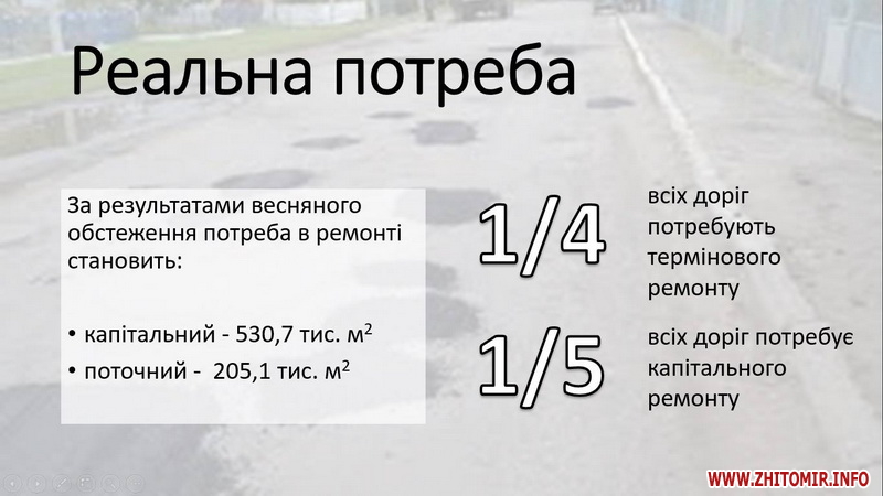 Відповідно до акта весняного обстеження, дорожнє покриття на 409 вулицях та провулках Житомира є незадовільним. Загальна площа доріг, де необхідно провести ремонт, – 735,2 тис. кв. м, зокрема, капітальний – на 530,7 тис. кв. м, поточний – на 205,1 тис. кв. м. Всього ж у Житомирі – 3 млн кв. м. доріг. Тобто, згідно з актом, чверть доріг потребують поточного або ж капітального ремонту.