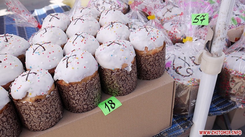 До Великодня лишаються лічені дні, тому люди, які відзначають свято, вже затоварюються на базарах та у магазинах. До прикладу, на Житньому ринку в Житомирі продавці пропонують неабиякий асортимент великодньої випічки з різними начинками.