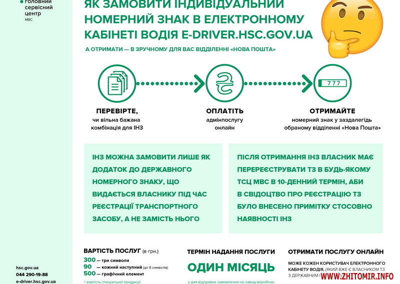 «Для того, щоб скористатися новою послугою, потрібно авторизуватися в Електронному кабінеті водія. Онлайн-сервіс доступний на сайті e-driver.hsc.gov.ua та на Урядовому порталі kmu.gov.ua у розділі «Електронні послуги». Доступ до е-Кабінету здійснюється за допомогою цифрового підпису, BankID або MobileID. У розділі «Замовлення ІНЗ» потрібно підібрати індивідуальний номерний знак, перевіривши його унікальність та зовнішній вигляд. Якщо введений номер іще ніким не зайнятий, система автоматично розрахує вартість замовлення ІНЗ. На цьому етапі користувач може обрати один серед двох можливих способів отримання ІНЗ: доставка у відділення «Нова пошта» або можливість самостійно забрати виготовлені номери у Головному сервісному центрі МВС у Києві (безкоштовно). Наступний етап — автоматичне формування заяви на отримання ІНЗ, яку користувач повинен підписати за допомогою власного кваліфікованого електронного підпису (КЕП). Завершенням процесу отримання послуги є оплата ІНЗ. Вартість послуги доставки «Нова пошта» фіксована – 500 грн», - інформує Регіональний сервісний центр МВС у Житомирській області.