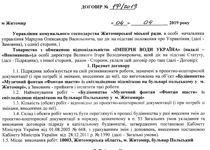 Договір підписали начальник управління комунального господарства міськради Олександр Марцун і директор ТОВ «Імперія води Україна» - Ігор Великий. Фірма зареєстрована у Києві на проспекті Героїв Сталінграда.