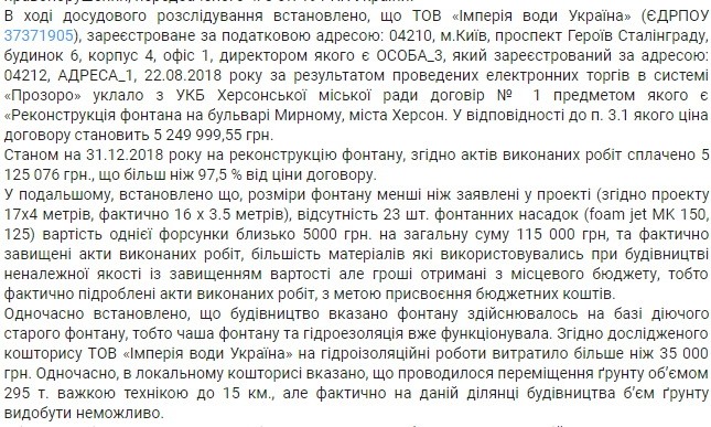 «В ході досудового розслідування встановлено, що ТОВ «Імперія води Україна» (…) уклало з УКБ Херсонської міської ради договір, предметом якого є «Реконструкція фонтана на бульварі Мирному міста Херсон», ціна якого становить 5 249 999,55 грн (…). У подальшому встановлено, що розміри фонтану менші, ніж заявлені у проекті (виділено редакцією), відсутні 23 шт. фонтанних насадок (…) на загальну суму 115 000 грн, та фактично завищені акти виконаних робіт (…). Одночасно встановлено, що будівництво вказано фонтану здійснювалось на базі діючого старого фонтану, тобто, чаша фонтану та гідроізоляція вже функціонували (однак у кошторисі) зазначено, що на гідроізоляційні роботи ТОВ «Імперія води Україна» витратило більше ніж 35 тис. грн. У локальному кошторисі вказано, що проводилося переміщення ґрунту об’ємом 295 тонн важкою технікою до 15 км, але фактично на даній ділянці будівництва (такий) об’єм ґрунту видобути неможливо», - йдеться в матеріалах суду.