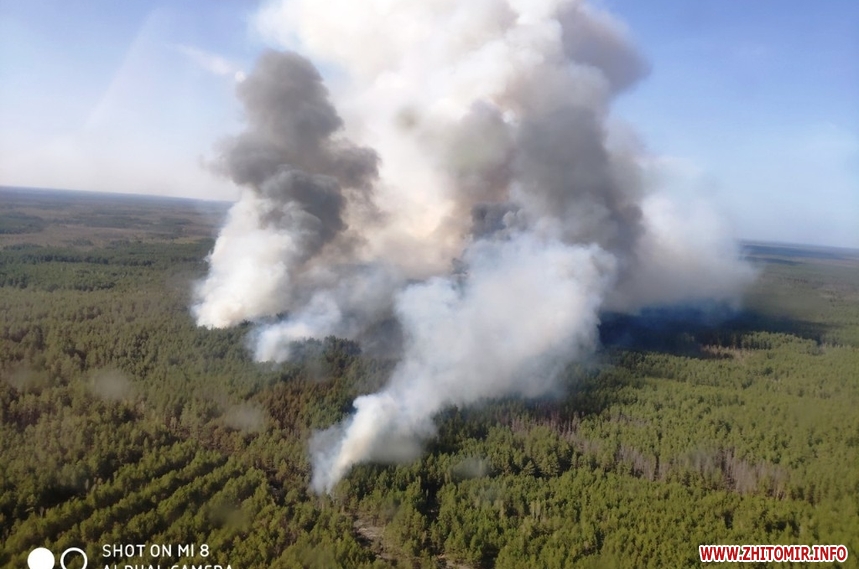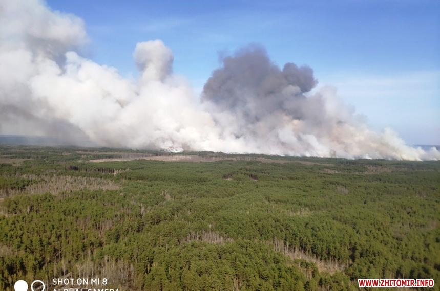 «25 квітня о 16:00 до ДСНС надійшла інформація про те, що поблизу с. Борутино Овруцького району на території ДП «Овруцького спеціалізованого лісового господарства» відбувається горіння лісової підстилки у двох осередках на площі близько 10 га. Гасіння пожежі ускладняється неможливістю під'їзду техніки та доступу особового складу до окремих осередків пожежі. Всього до гасіння пожежі залучено 74 чол. та 6 од. тех., з них від ДСНС - 14 чол. о/с та 3 од. тех., у тому числі 1 од. пожежної авіації (АН-32П)», - йдеться у повідомленні.