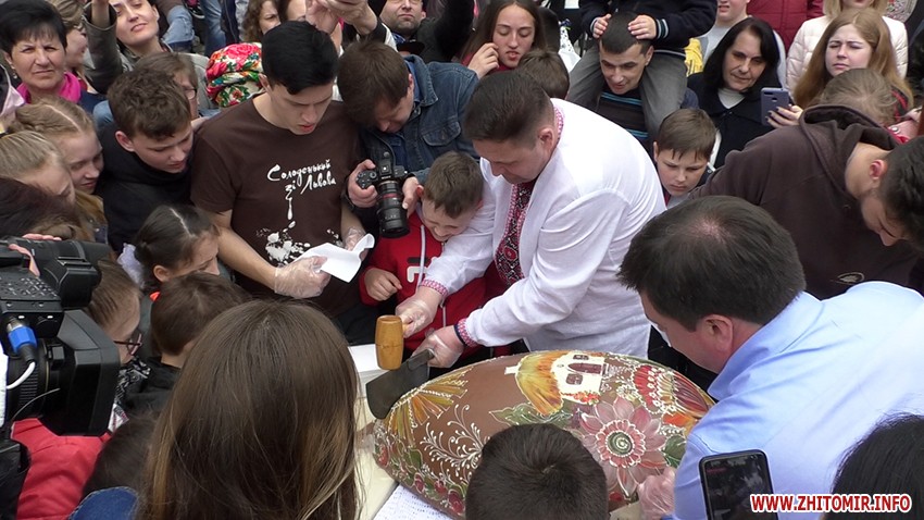 На Великдень, 28 квітня, біля Львівської майстерні шоколаду у Житомирі розбили 100-кілограмову писанку з молочного шоколаду. ЇЇ шматочки спочатку отримали дітки з інвалідністю та онкохворі, а потім шоколад роздавали усім охочим.