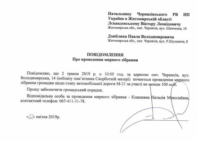 «Звертаюся до Вас навіть не як посадовець, а як громадянин, житель одного з районів, що на шляху горезвісної траси М-21. Вибору не маємо, нас навіть не «почули»! Завтра о 10.00 год. чекаю на усіх, кого теж не влаштовує стан цього автошляху, біля пам‘ятника Скорботній матері в смт Черняхів. Таки будемо перекривати дорогу! Прошу усіх планувати свої поїздки даним маршрутом з урахуванням цієї обставини. Заздалегідь вибачте за тимчасові незручності», - написав нардеп 1 травня.