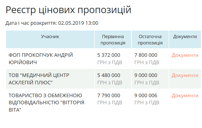 Заявки на участь в аукціоні подали ФОП Прокопчук Андрій Юрійович, ТОВ «Медичний центр «Асклепій плюс» та ТОВ «Вітторія Віта», яке від початку аукціону запропонувало найбільшу ціну – 7 млн 790 тис. грн.