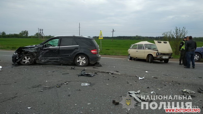 Як повідомили в поліції, попередньо встановлено, що близько 14.50 водій автомобіля «Mercedes-Benz», 49-річний житомирянин, рухаючись у напрямку м. Києва, не врахував дорожню обстановку та здійснив зіткнення з автомобілем ВАЗ- 2106 під керуванням 69-річного киянина, який зупинився в крайній лівій смузі для виконання маневру повороту ліворуч і надавав перевагу у русі зустрічним транспортним засобам.