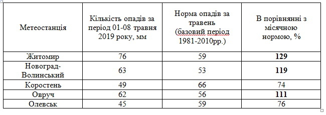 «Протягом 1-8 травня 2019 року погода Житомирщини формувалась під впливом серії атмосферних фронтів, внаслідок чого на всій території області відмічались інтенсивні дощі, а в окремі доби пройшли значні дощі. Найбільша кількість опадів припала на південні райони області та м. Житомир, де лише за добу 7 та ніч 8 травня випала майже місячна норма опадів (виділено редакцією)», - інформують синоптики.