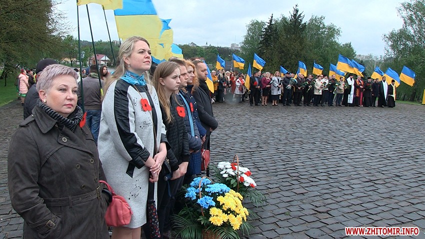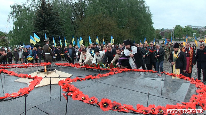 На мітинг-реквієм з нагоди Дня пам’яті та примирення 8 травня до монумента Слави у Житомирі прийшло кілька сотень людей. Захід розпочали хвилиною мовчання та молитвою представників релігійних конфесій за загиблих у Другій світовій війні. Під час мітингу-реквієм ансамбль «Зоряночка» влаштував флешмоб, присвячений червоному маку. Наостанок під супровід військового оркестру учасники заходу поклали квіти до «вічного вогню».