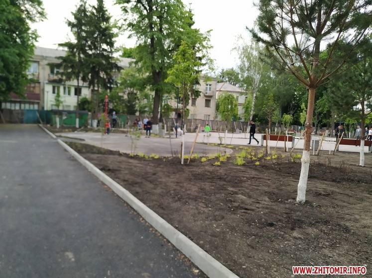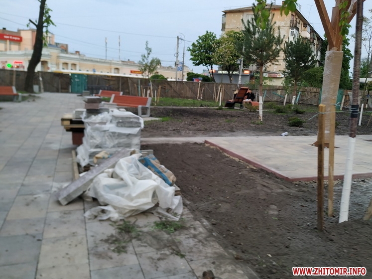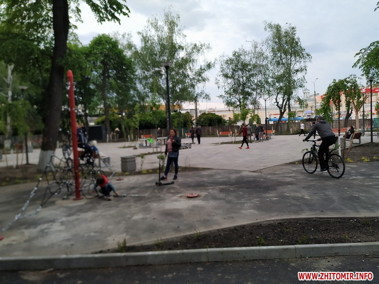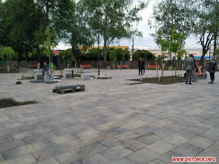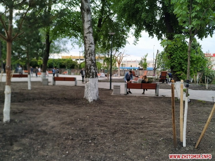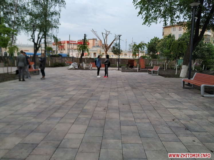 Так, надвечір 14 травня журналісти Житомир.info нарахували в новому сквері щонайменше кілька десятків людей, які прогулювались по вимощеним алеям, відпочивали на новеньких лавках, призначали зустрічі та бавилися з дітьми. Однак тут ще багато що нагадує про незавершений ремонт: на алеях продовжує чекати свого часу тротуарна плитка, подекуди валяється будівельне сміття. Та і сам паркан, який огороджує майданчик, досі залишається на своєму місці.