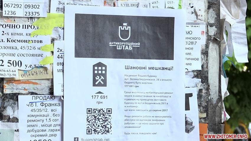 «У будинку за моєю спиною був проведений до серпня 2017 року ремонт каналізації в підвальному приміщенні на 177 тисяч гривень. Відповідно ми зараз розмістимо ці оголошення, і якщо місцеві мешканці прочитають, побачать, що ремонт був проведений неякісно, якщо після цього були повторні прориви чи інше, то вони можуть звернутись до нас, а ми звернемось до замовників, щоб підрядник був змушений в рамках гарантійних строків виправити ситуацію», - розповідає аналітик ГО «Антикорупційний штаб» Ілля Кротенко.