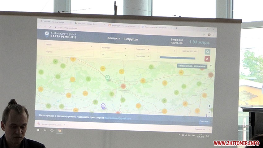 15 травня представники громадської організації «Антикорупційний штаб» у Житомирі презентували карту ремонтів, де відображена інформація про роботи, на які виділялись кошти із бюджету. Тут можна також дізнатись інформацію про замовника, підрядника та вартість ремонту. На думку представників ГО «Антикорупційний штаб», це дозволить кожному слідкувати за ефективним використанням бюджетних коштів.