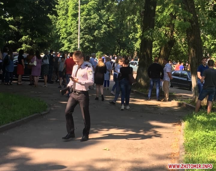«Близько 8.35 год. 27 травня до поліції надійшли анонімні повідомлення про закладення вибухівки у приміщенні кількох навчальних закладів обласного центру. Одразу ж після отримання тривожних повідомлень за вказаними адресами виїхали слідчо-оперативні групи Головного управління Нацполіції в області та Житомирського відділу поліції, працівники вибухотехнічної служби та представники інших правоохоронних відомств і екстрених служб. Правоохоронці обмежують доступ до потенційно небезпечних територій. Патрульні поліцейські забезпечують безпеку руху транспорту. Працівники вибухотехнічної служби ГУНП, застосовуючи спеціальні технічні засоби, проводять ретельний огляд приміщень та навколишніх територій. Інформація про події належним чином зареєстрована. Водночас розпочато заходи зі встановлення осіб авторів тривожного повідомлення», - повідомили у поліції.