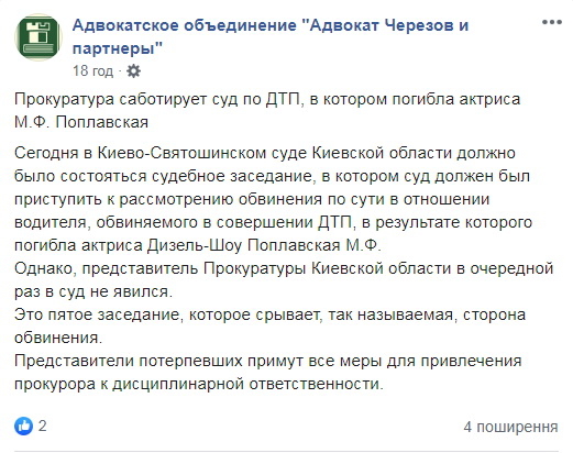 «Сьогодні (29 травня) в Києво-Святошинському суді Київської області мало відбутися судове засідання, в якому суд мав приступити до розгляду звинувачення по суті щодо водія, якого звинувачують у скоєнні ДТП, в результаті якої загинула актриса Дизель-Шоу Поплавська М.Ф. Однак, представник прокуратури Київської області в черговий раз на судове засідання не з'явився. Це п'яте засідання, яке зриває так звана сторона звинувачення», - інформує адвокатське об’єднання і додає: представники потерпілих вживуть усіх заходів для залучення прокурора до дисциплінарної відповідальності.