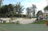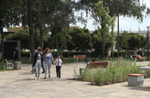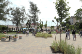 Територія озеленена, доріжки викладені бруківкою, дитячі зони зі штучним покриттям. Є велопарковка, безплатний туалет, лавки, столи для шахів, «сонячне дерево» для підзарядки ґаджетів, фонтан. Як і планувалося, на деяких «острівцях» буяє висока декоративна трава.