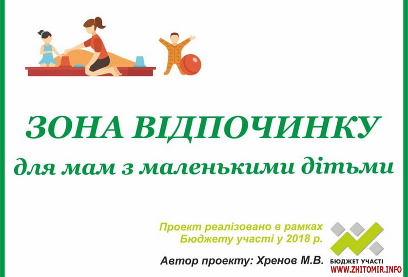 1 червня у житомирському гідропарку відбулася презентація та відкриття зони відпочинку для мам з маленькими дітьми. Облаштувати зону відпочинку вдалося завдяки коштам бюджету участі та проекту колишнього заступника міського голови, нині радника міністра охорони здоров’я України Матвія Хренова, який став одним із переможців.