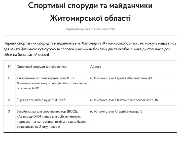 За наявною інформацією, в Житомирській області є лише три спортивні споруди та майданчики, які можуть надаватись для занять фізичною культурою та спортом учасникам бойових дій та особам з інвалідністю внаслідок війни на безоплатній основі. Всі вони знаходяться в обласному центрі.