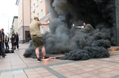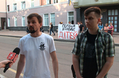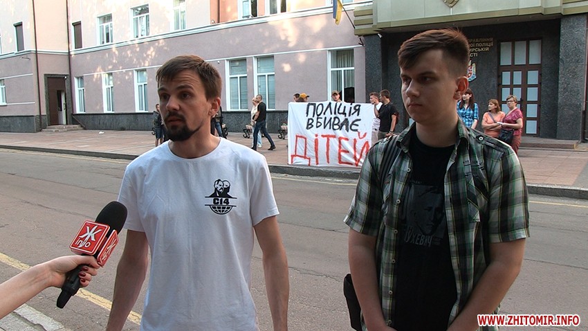 «Декілька днів тому п'яні поліцейські в Переяславі-Хмельницькому Київської області вирішили побавитись, тому що їм захотілось постріляти посеред міста по банках. В результаті вони підстрелили 5-річного хлопчика з табельної вогнепальної зброї, і після чого він помер в реанімації. Ми прийшли сюди сьогодні для того, щоб оголосити свої вимоги, так як і по інших містах України. Наші вимоги пов’язані з тим, щоб відбулося дійсно розслідування, щоб винні були покарані, щоб міністр внутрішніх справ Арсен Аваков написав рапорт на відставку, адже особа, яка знаходиться на такій посаді і не може контролювати своїх підлеглих, вона не гідна займати таку посаду», - розповідає координатор організації «С14» в Житомирі Сергій Палькевич.