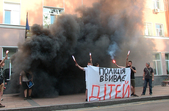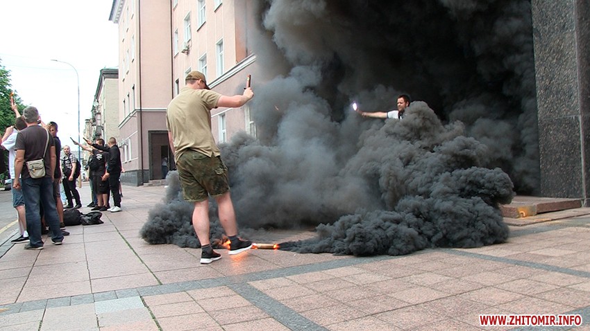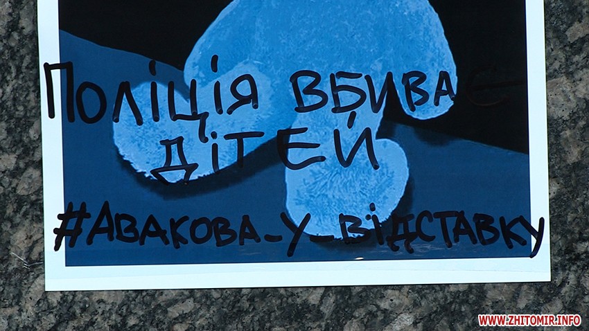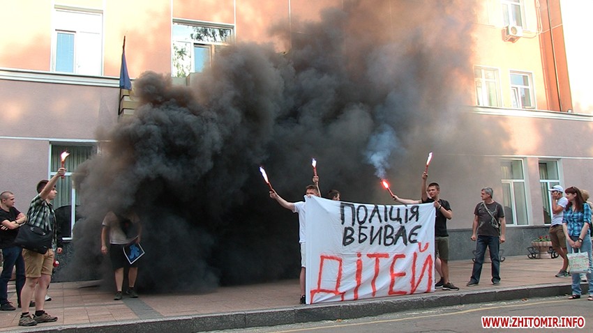 У Житомирі учасники акції прийшли з плакатом «Поліція вбиває дітей», під двері ГУНП запустили димові шашки та залишили на згадку декілька написів на будівлі.