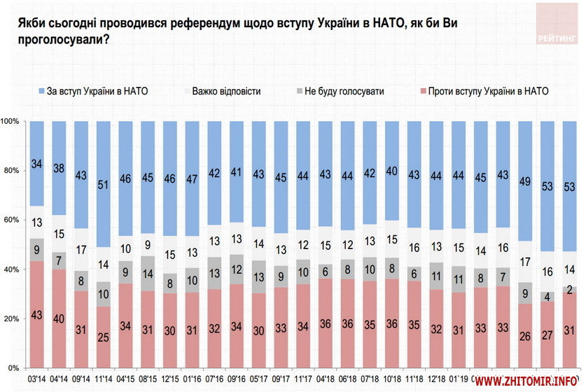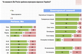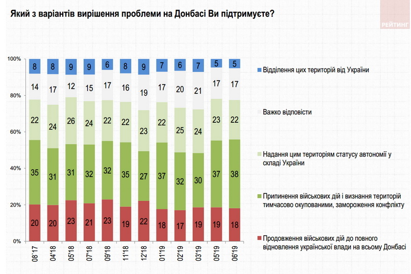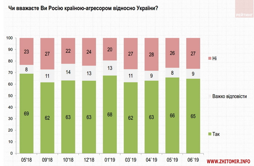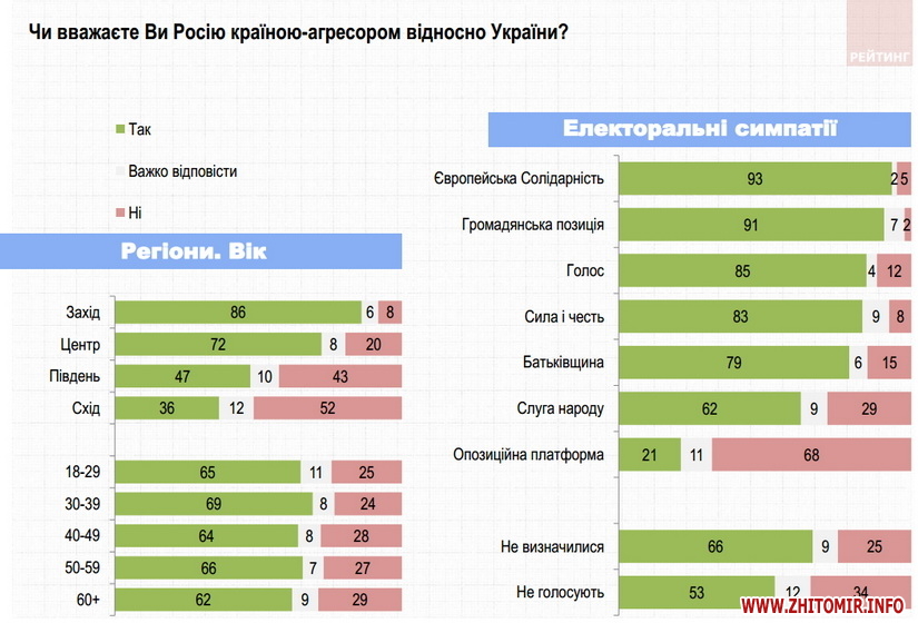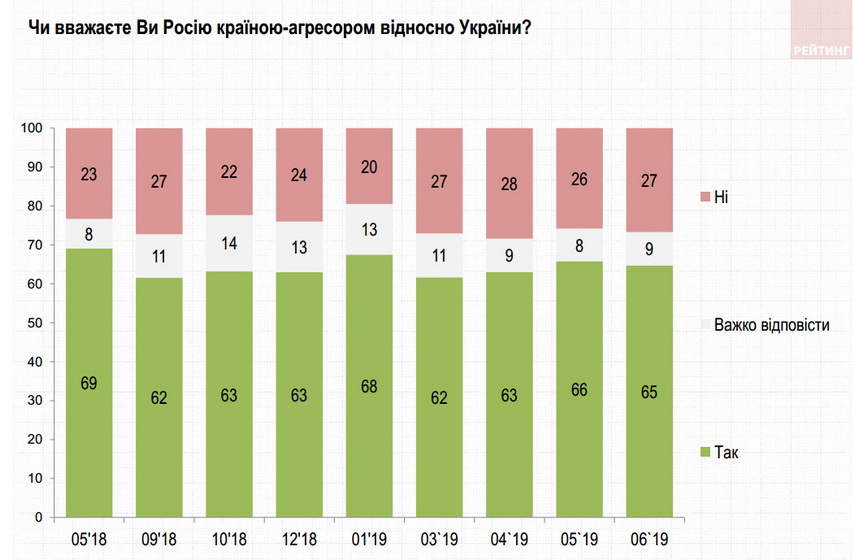 65% вважають Росію агресором щодо України. 27% – протилежної думки. При цьому більше 60% – за дипломатичні шляхи врегулювання проблеми війни на Донбасі (38% – за припинення військових дій та замороження конфлікту, 22% – за надання цим територіям самостійного або ж федеративного статусу у складі України). Лише 5% – за повне відділення окупованих земель. З іншого боку 18% підтримують продовження військових дій до повного відновлення української влади на всьому Донбасі.
