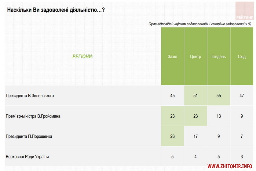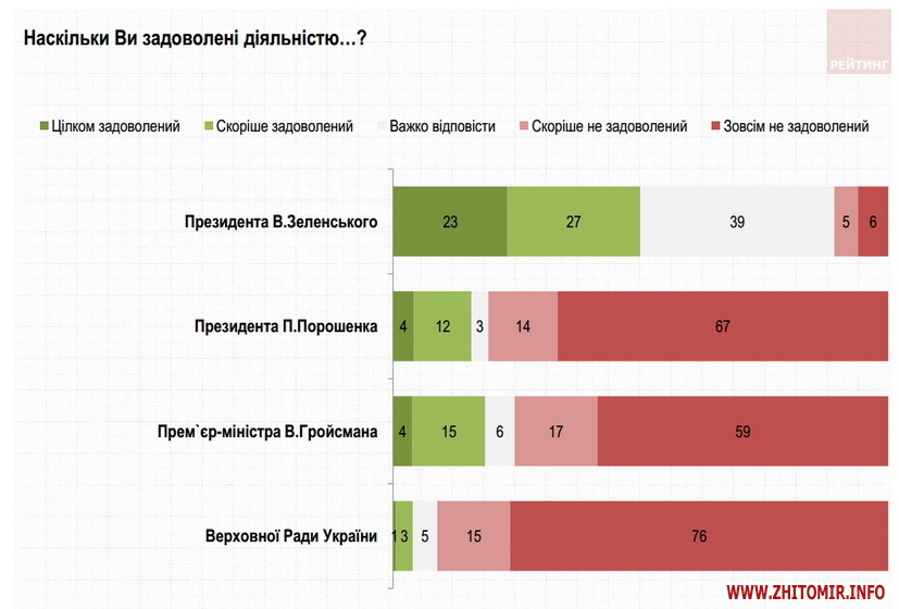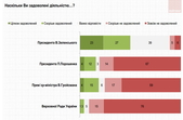 Половина опитаних задоволені діяльністю новообраного Президента В.Зеленського, лише 11% – протилежної думки. При цьому 39% ще не змогли оцінити роботу новообраного Глави держави. Діяльністю колишнього Президента П.Порошенка задоволені 16% опитаних, понад 80% – не задоволені. Діяльністю очільника Уряду В.Гройсмана задоволені 19%, не задоволені – 76%. Роботою Верховної Ради не задоволені більше 90% опитаних.