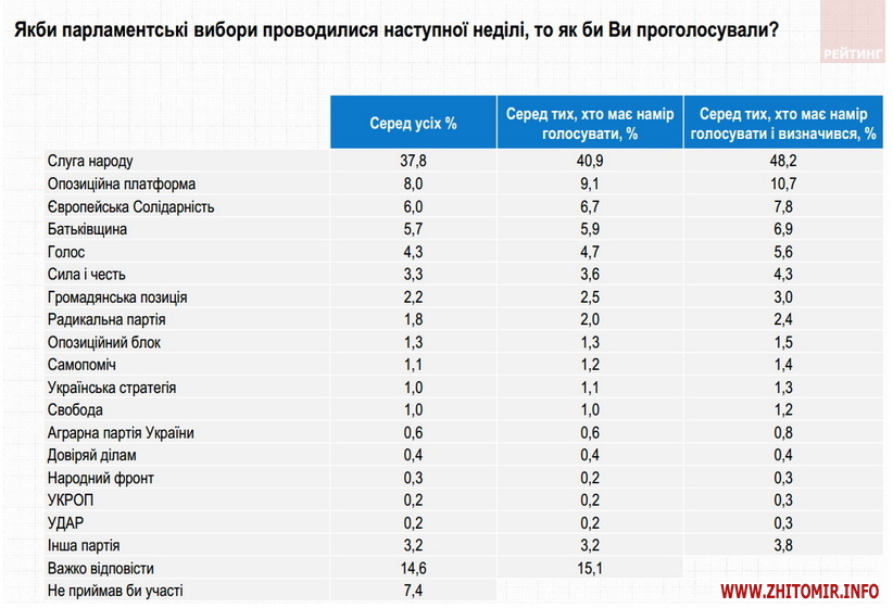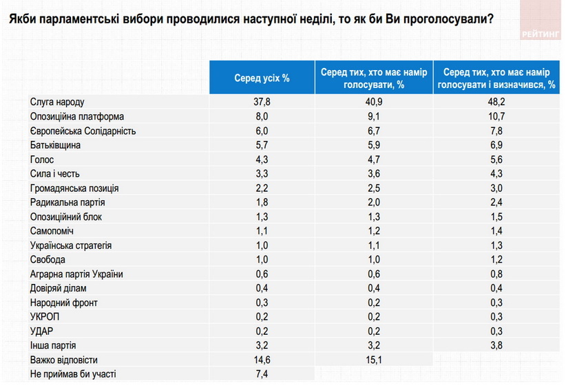 Нагадаємо, результати опитування, проведеного соціологічною групою «Рейтинг» 16-21 травня 2019 року, показували, що партію «Слуга народу» готові підтримати 43,8% тих, хто має намір голосувати і визначився з симпатіями, за «Опозиційну платформу – За життя» – 10,5%, БПП Солідарність – 8,8%, Батьківщину – 7,3%, партію «Сила та честь» І.Смешка – 5,1%, партію С.Вакарчука – 4,6%.