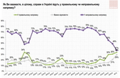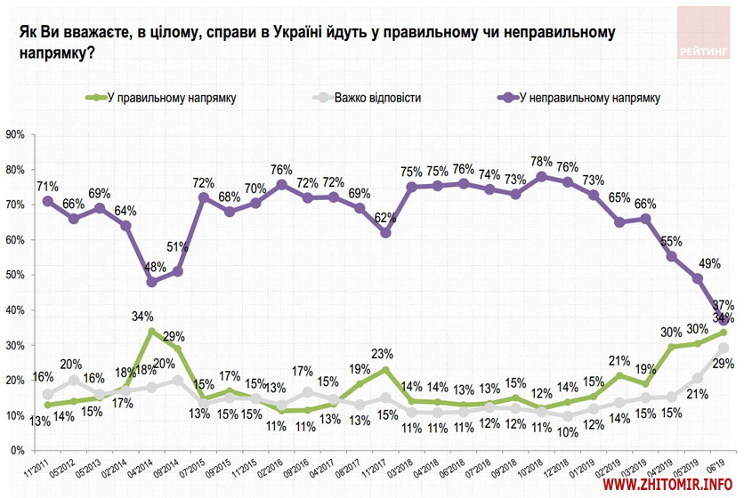 34% опитаних заявили, що Україна рухається у правильному напрямку, 37% – протилежної думки, ще 29% – не визначилися. Динаміка зміни настроїв населення у позитивний бік далі продовжується. Відносно більше тих, хто має оптимістичніші погляди на стан справ у країні, спостерігаються серед мешканців Центру та Півдня, наймолодших респондентів, а також виборців партій «Слуга народу» та «Сила і честь». Натомість прихильники партій «Європейська солідарність» та «Опозиційна платформа - За життя» – найбільш песимістичні в цьому питанні.