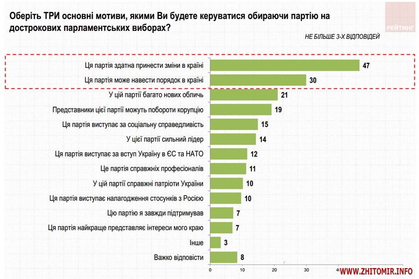 47% опитаних зазначили що головним мотивом, яким вони будуть керуватися при виборі політичної сили під час голосування, буде здатність партії принести зміни в країні. Ще 30% сказали, що голосуватимуть, виходячи із здатності політичної сили навести порядок у країні. Кожен п’ятий сказав, що мотивується тим, що у політичній силі є багато нових обличь, або ж її представники здатні побороти корупцію. Для 14-15% головними мотивами є те, що партія виступає за соціальну справедливість та має сильного лідера.