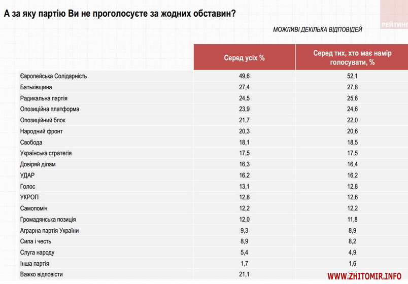 Антирейтинг партій очолює «Європейська Солідарність». За неї за жодних обставин не проголосували б 52% виборців.