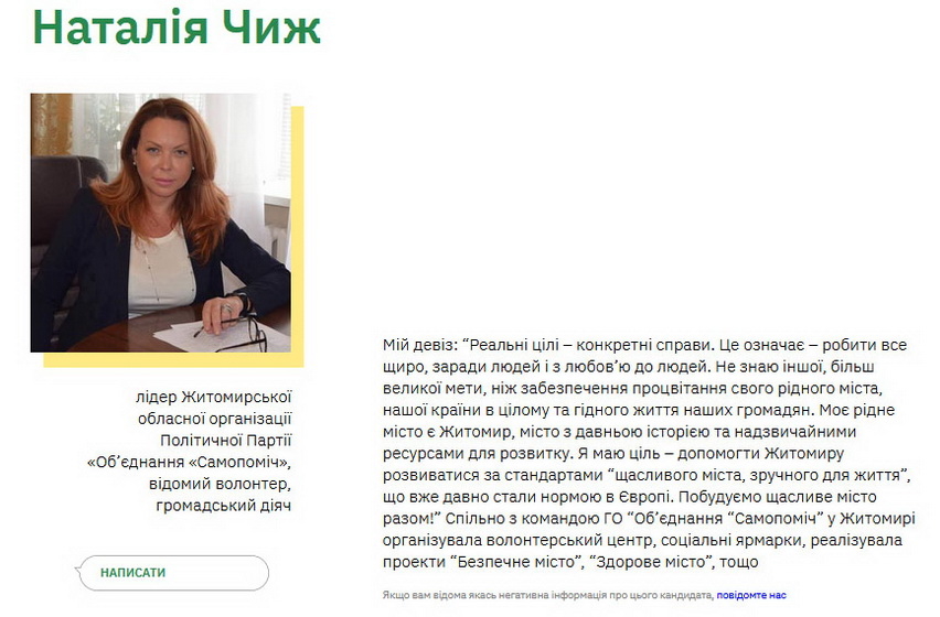 На офіційному сайті «Самопомочі» також вже є інформація і фото деяких кандидатів у народні депутати, зокрема – Наталії Чиж.
