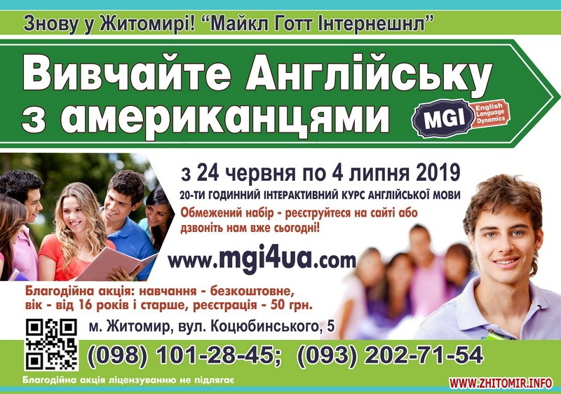 Курс розмовної англійської мови MGI знову у Житомирі! Благодійна акція! Навчання – безкоштовне. Реєстраційний внесок – 50 грн. У червні маєте чудову нагоду покращити володіння англійською в живому спілкуванні з носіями мови. У цьому році команда вчителів перебуватиме у Житомирі з 24 червня по 4 липня 2019р. Навчання проводиться на шести різних рівнях: від початкового, розрахованого на тих, хто робить лише перші кроки в англійській, до поглибленого, на якому займаються люди, що вільно володіють мовою, але не хочуть зупинятися у своєму розвиткові. Заняття проводяться у невимушеній атмосфері живого спілкування і спрямовуються у першу чергу на вироблення та закріплення практичних мовних навичок. На навчання запрошуються усі охочі віком від 16 років. Для запису на курси відкрито попередню реєстрацію за онлайн-адресою: