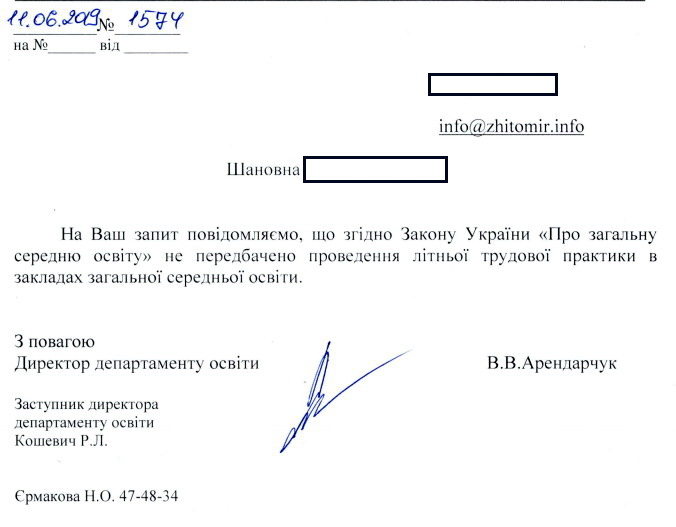 «На ваш запит повідомляємо, що згідно з Законом України «Про загальну середню освіту» не передбачено проведення літньої трудової практики у закладах середньої освіти», - йдеться у тексті відповіді за підписом начальника департаменту Валентина Арендарчука.