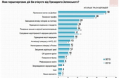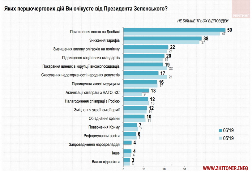 Половина опитаних очікують від Президента В.Зеленського вирішення питання припинення вогню на Донбасі. 38% – мають сподівання стосовно зниження тарифів, 22% – очікують зменшення впливу олігархів на політику, 20% – чекають підвищення соціальних стандартів, 19% – покарання винних у корупції високопосадовців, 17% – скасування недоторканності народних депутатів, 16% – підвищення якості медицини, 13% – активізації співпраці із НАТО та ЄС, 12% – налагодження співпраці із Росією, 12% – зміцнення української армії, 10% – об’єднання країни.