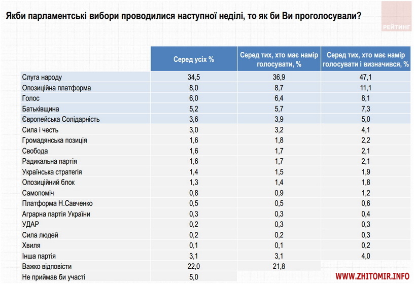 Як повідомляв Житомир.info, 16-21 травня 2019 року результати опитування показували, що партію «Слуга народу» готові підтримати 43,8%, «Опозиційну платформу – За життя» – 10,5%, БПП Солідарність – 8,8%, Батьківщину – 7,3%, партію «Сила та честь» І.Смешка – 5,1%, партію С.Вакарчука – 4,6%.