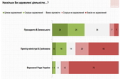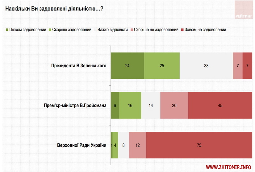 Половина опитаних задоволені діяльністю Президента України В.Зеленського, 14% – протилежної думки, ще 38% – поки не змогли сформувати своє ставлення до нього. 22% позитивно оцінюють роботу очільника Уряду В.Гройсмана, з іншого боку 65% – негативно. Роботою Верховної Ради незадоволені майже 90% респондентів, задоволені – лише 5%.