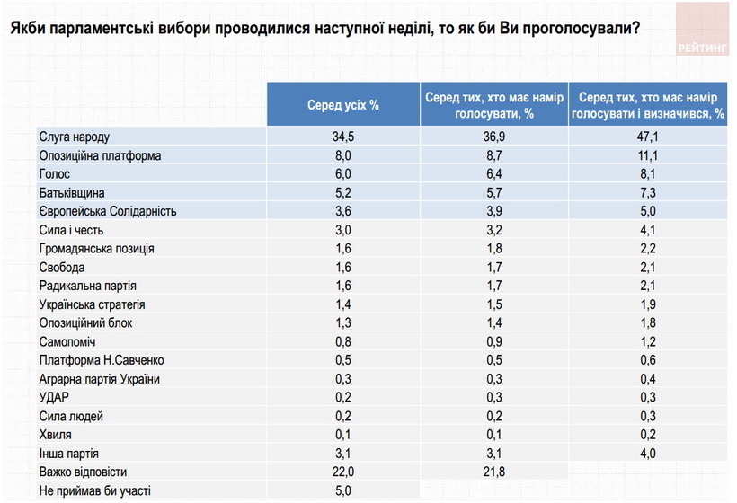 Лідером електоральних симпатій серед політичних сил є партія «Слуга народу», яку готові підтримати 47,1% тих, хто має намір голосувати і визначився з симпатіями. Також, наразі, долають прохідний бар’єр «Опозиційна платформа – За життя» (11,1%), партія «Голос» (8,1%), «Батьківщина» (7,3%). «Європейська Солідарність» (5,0%). Партію «Сила і честь» готові підтримати 4,1%, партію «Громадянська позиція» – 2,2%, Радикальну партію – 2,1%, партію ВО «Свобода» – 2,1%, партію «Українська стратегія» – 1,9%, Опозиційний блок – 1,8%, Самопоміч – 1,2%. Рейтинг інших політичних сил – менше 1%.